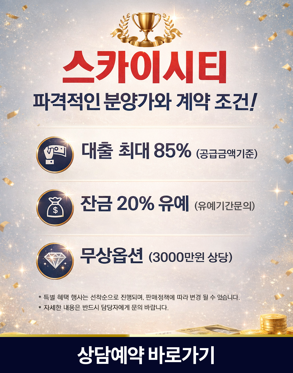 호매실 SKY CITY 방문예약 고객의 개인정보를 수집합니다. 수집한 개인정보는 방문예약 이외의 목적으로는 사용하지 않으며,모집 기간 완료 후 즉시 파기합니다. 개인정보의 수집 및 이용에 대한 동의를 거부할 수 있으며, 이 경우 방문예약 접수가 어려울 수 있습니다.